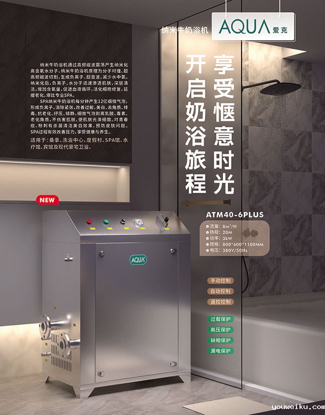 AQUA 爱克纳米牛奶浴机工作原理神奇而高效,通过高频磁波震荡产生纳米化高含氧水分子。纳米化后的负离子、水分子如同获得了 “加速通行证”,可迅速渗透肌肤,实现深层清洁,为肌肤注入充足氧气,促进血液循环,唤醒细胞活力,修复受损细胞,延缓衰老进程,让您从内而外散发年轻活力,尽享品质生活。选择 AQUA 爱克纳米牛奶浴机,就是选择一种健康、纯净、水润的生活方式,开启您的专属 SPA 之旅,拥抱生活的每一刻美好。